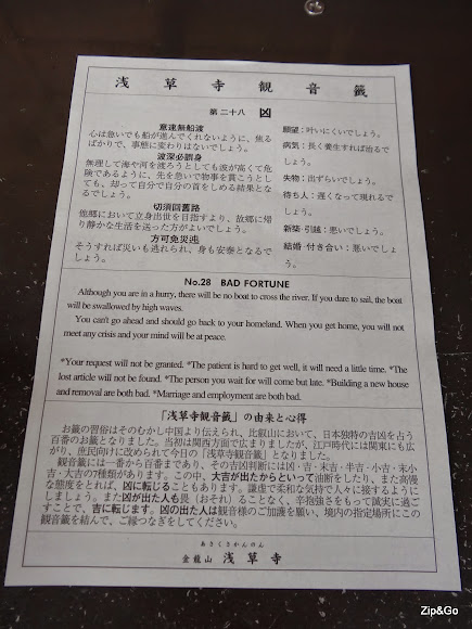 En la misma zona encontramos el omikuji, unos papeles que predicen tu fortuna y que están presentes en la mayoría de santuarios y templos. Para conocer tu sino tienes que pagar 100 yenes (1 euro), coger un palito de un bote metálico, en ese palito viene un número, después tienes que abrir el cajón que se corresponda con dicho número y finalmente sacar una hoja que describe tu porvenir. Como no podía ser de otra manera, a mí me ha salido "mala suerte". Además, el papel viene a decir algo así como que tengo que volver a mi casa y una vez allí se me pasarán todos los males. Por suerte nuestro guía de hoy, mi amigo Koji, nos ha explicado que unas planchas metálicas que había cerca sirven para atar los papeles, de esta manera los buenos augurios se cumplen y los malos se evitan. Por cierto, a él le ha tocado "buena suerte". Todo esto lo entenderéis mejor viendo la siguiente serie de imágenes.